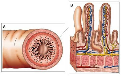 | Vilosidades intestinais (saliências em forma de dedo de luva que possuem ainda microvilosidades) |